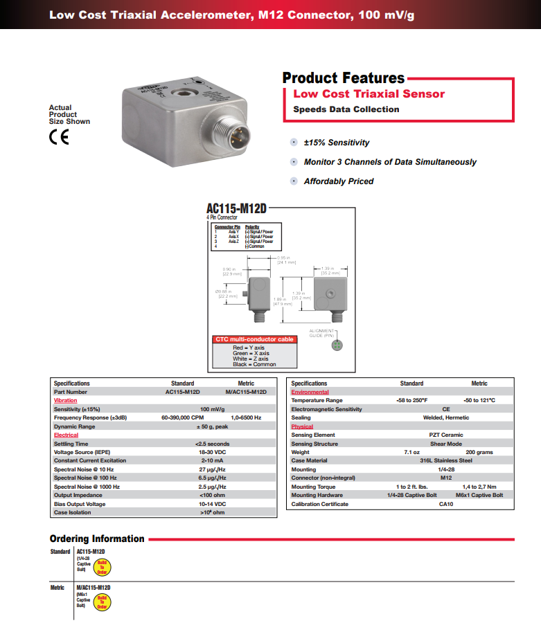 CTC低成本三軸加速度振動計AC115-M12D,連接器/電纜,100 mV / g,4針M12連接器,通過CTC。