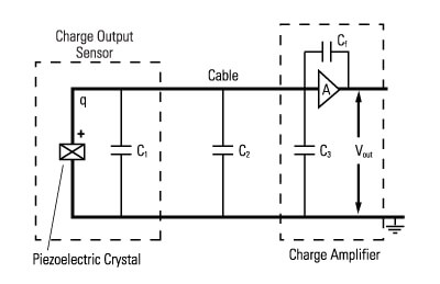 圖4顯示了電荷放大系統的示意圖,包括傳感器,電纜和電荷放大器。再一次,絕緣電阻(信號和地之間的電阻)假設很大(> 1012歐姆),因此不是如圖所示。