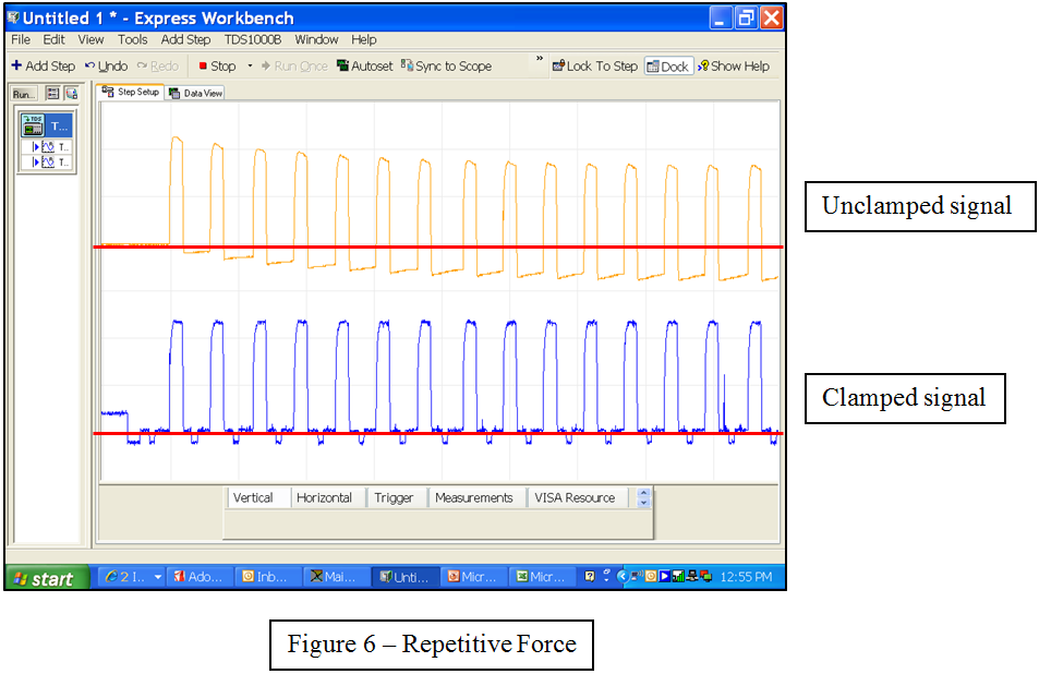 在許多力監測應用中,期望監測可能在彼此的短時間間隔內發生的一系列零到峰重復脈沖。該輸出信號通常被稱為“脈沖序列”。來自ICP®石英力傳感器的交流耦合輸出信號將隨時間衰減至平衡狀態。這使得正峰值力似乎減小,并且難以精確地監測連續的零峰值輸出信號(圖6)。