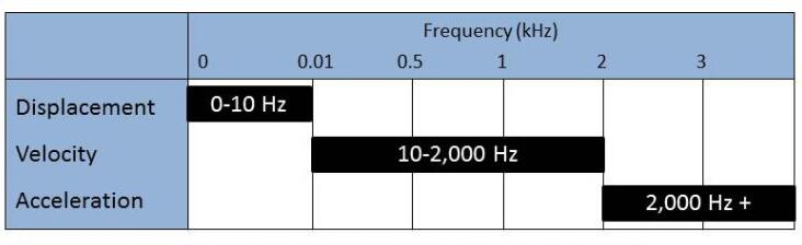 ***合適的測量單位通常取決于振動的頻率。由慢速工業(yè)機械產生的低頻振動在加速度方面僅產生少量振動,在速度方面產生適度振動,但由于其低速振動而在位移方面產生大幅振動。相反,高頻振動在位移方面僅產生少量振動,在速度方面產生適度振動,但由于其高速振動而在加速方面產生大幅振動。有關何時應以加速度,速度或位移測量振動的指導,請參見上圖。